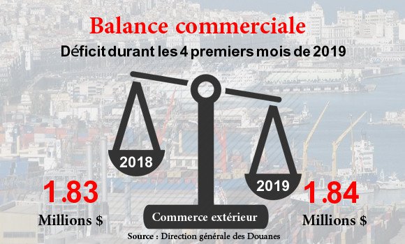 La balance commerciale de l’Algérie a connu un déficit de 1,84 milliard de dollars durant les quatre premiers mois 2019, contre un déficit de 1,83 à la même période en 2018, a appris l’APS auprès de la direction générale des Douanes (DGD).