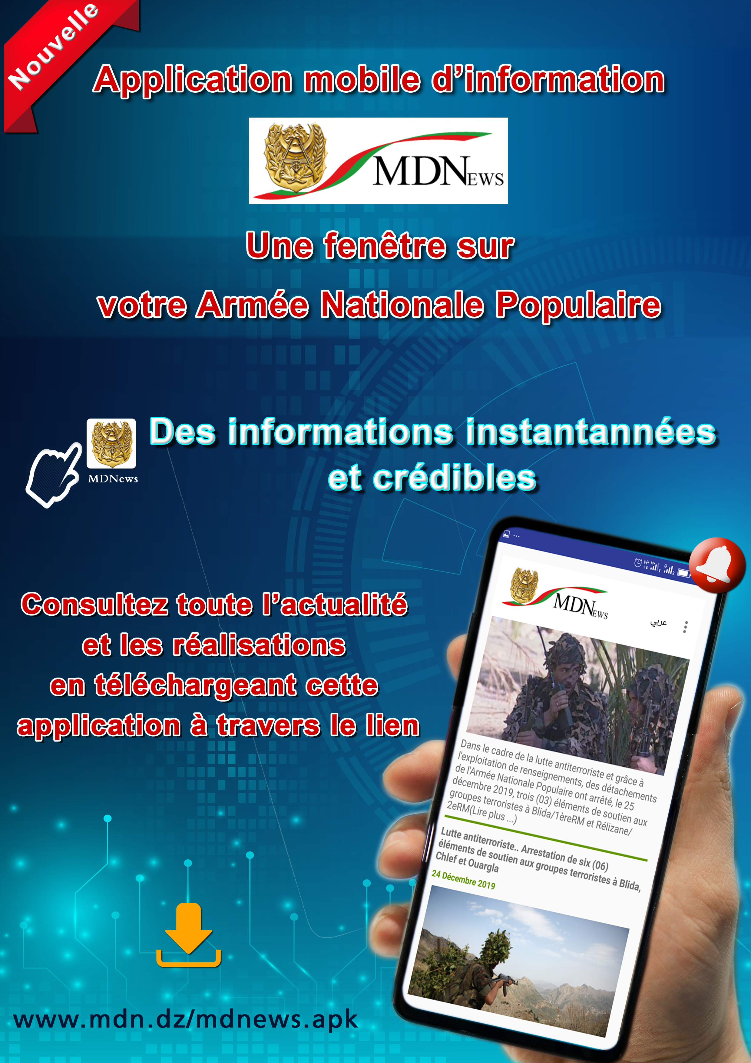 « Œuvrant à être au diapason des développements des technologies de l’information et de la communication, et afin de garantir une information objective, efficace et instantanée, le Ministère de la Défense Nationale informe les citoyens et les médias qu’une nouvelle application électronique a été mise en place pour permettre un accès immédiat à toute l’actualité et les informations du Ministère de la Défense Nationale, notamment les communiqués de presse, les annonces de recrutement et du service national, ainsi que tout autre rendez-vous ou information », indique un communiqué du MDN qui souligne que la nouvelle application mobile d’information dénommée « MDNews » permet d’envoyer des notifications à ses utilisateurs pour toute actualité. Elle est disponible exclusivement sur le site web officiel du Ministère de la Défense Nationale (WWW.MDN.DZ), à travers le lien : www.mdn.dz/mdnews.apk