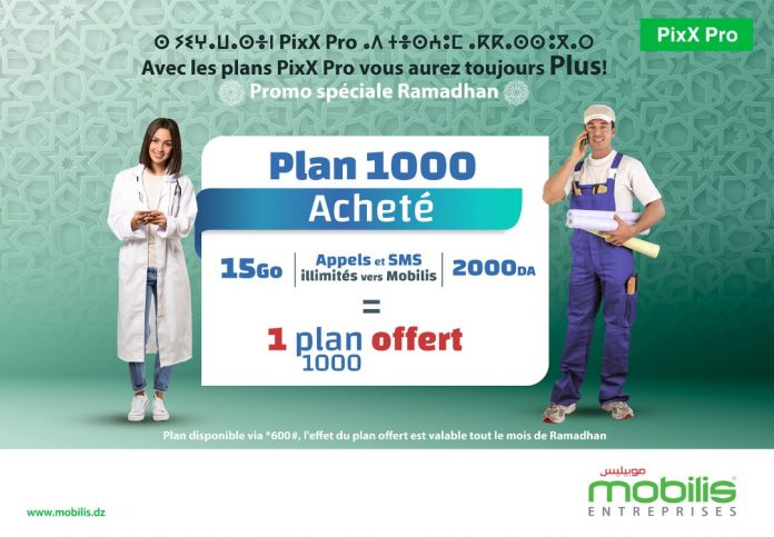 Mobilis célèbre le mois sacré de Ramadan avec ses clients, et lance une offre promotionnelle destinée aux abonnés Entreprises et professionnels de l’offre PixXPro 1000, sous le thème « Un Plan Offert pour chaque Plan Acheté ».