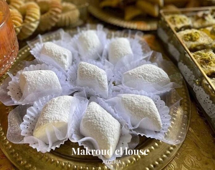 « Les Makroud el louse sont des gâteaux algériens sans farine composés d’amandes, d’œufs, de sucre et d’arôme de fleur d’oranger. Cuits jusqu’à ce qu’ils soient légèrement dorés, ces gâteaux sont généralement plongés dans du sucre en poudre afin de les enrober complètement. Une fois consommé, les Makroud el louse doivent fondre dans la bouche », écrit TasteAtlas, dans une publication sur X, anciennement Twitter.