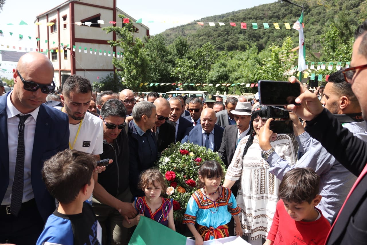 Accompagné du Secrétaire général du Haut commissariat à l’Amazighité (HCA), Si El-Hachemi Assad, et du wali de Bouira, Abdelkrim Laâmouri, le ministre a déposé, à son arrivée, une gerbe de fleur au pied d’une stèle érigée au milieu du village à la mémoire des martyrs des bombardements d’Ighzer Iwaquren le 6 mai 1957.